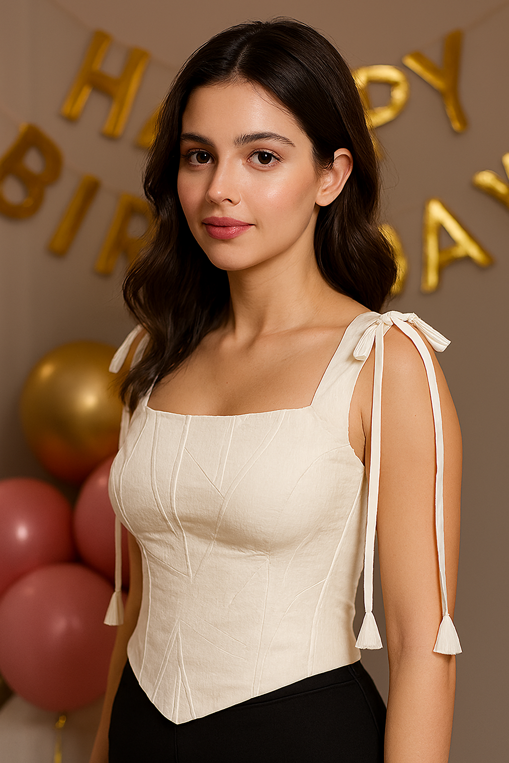 تاپ مجلسی دخترانه کاپدار کرمی روشن با یقه خشتی و بندینک قابل تنظیمبانوان
