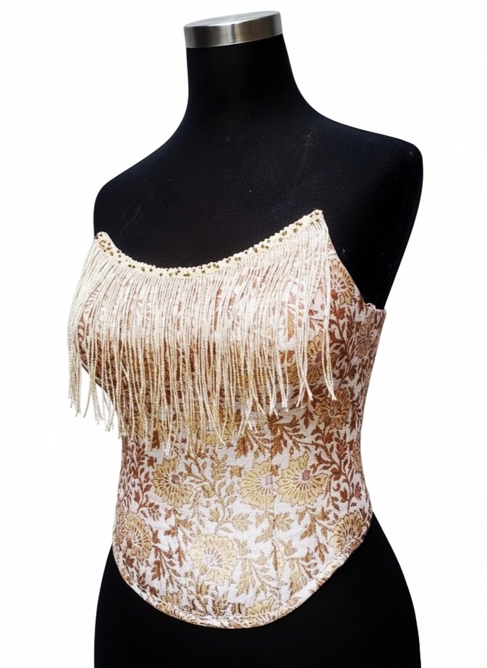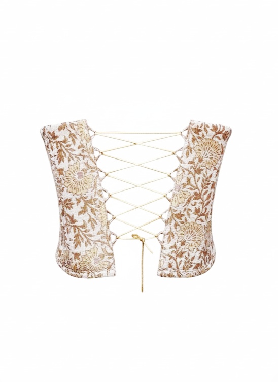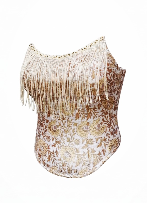 تاپ مجلسی دخترانه دکلته ژاکارد بژ و طلایی