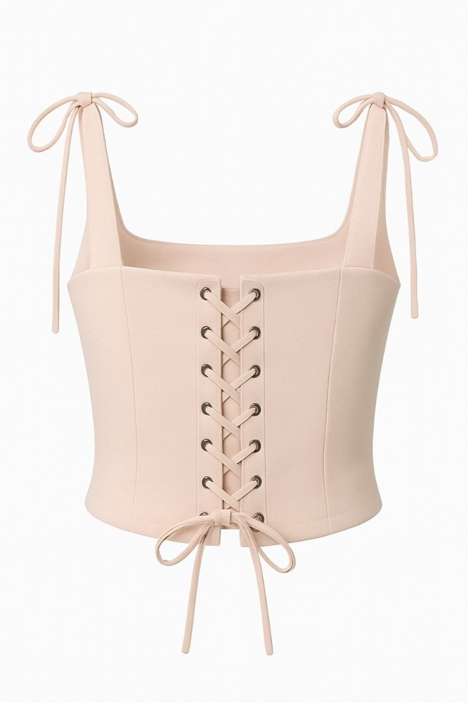 پشت این تاپ مجلسی کرمی روشن با حلقههای فلزی پانچشده طراحی شده که علاوه بر زیبایی، امکان بسته شدن دقیق و فیت مناسب را فراهم میکند. این مدل بهصورت استاندارد سایزبندی شده و با توجه به بندینک و ساختار استرکشی، روی اندام بهخوبی مینشیند.
